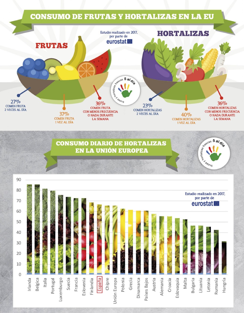 Estudio por parte de Eurostat en 2017. En 2017, alrededor de 1 de cada 4 personas (27%) comió fruta al menos dos veces al día, según una encuesta de población de la Unión Europea (UE). Otro 37% de la población de la UE comía fruta una vez al día y el 36% restante comía fruta con menos frecuencia o nada durante una semana normal.