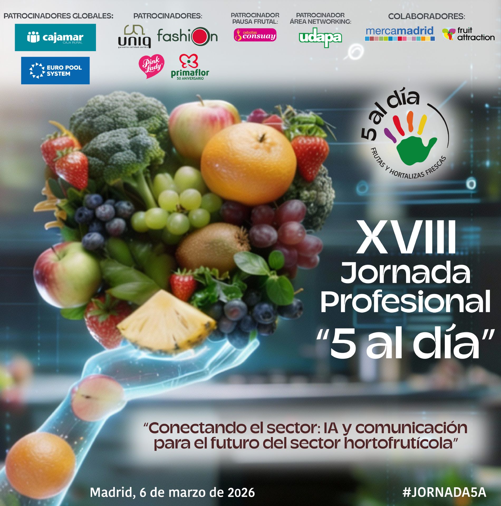 El próximo 6 de marzo de 2026 celebramos en Mercamadrid la XVIII Jornada Profesional “5 al día” bajo el lema “Conectando el sector: IA y comunicación para el futuro del sector hortofrutícola”, una cita pensada para parar, reflexionar y mirar al futuro del sector hortofrutícola con una mirada práctica, innovadora y muy conectada con la realidad actual.