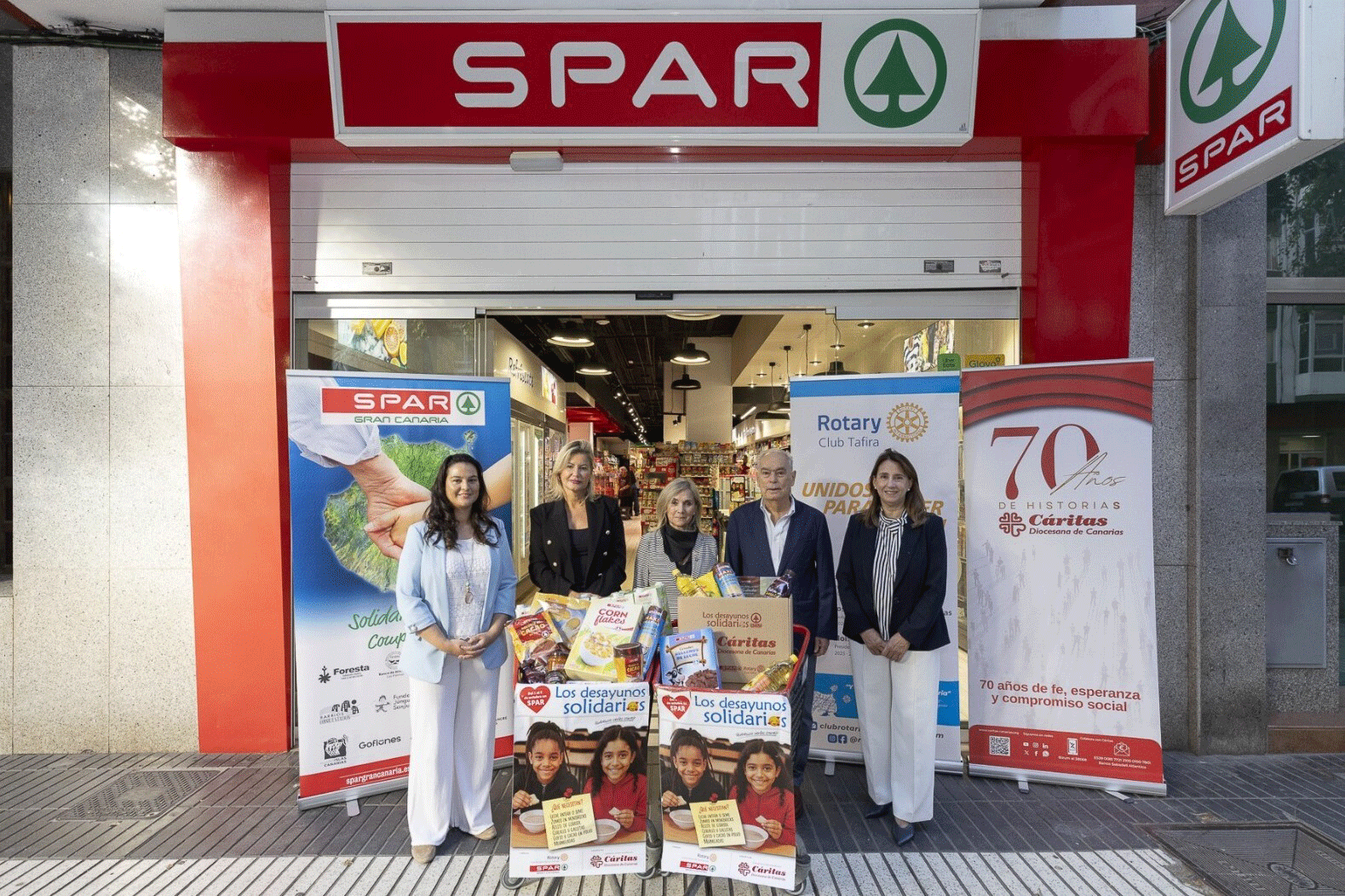 A la presentación de la campaña, celebrada en la tienda SPAR Tomás Morales, acudieron la directora general de SPAR Gran Canaria, Dunia Pérez; en representación de la propiedad de la cadena, Clara Medina; la directora de Responsabilidad Social Corporativa, Yubi Cisneros; y los presidentes de Rotary Club Las Palmas, Eloísa Moreno, y de Cáritas Diocesana de Canarias, Gonzalo Marrero.