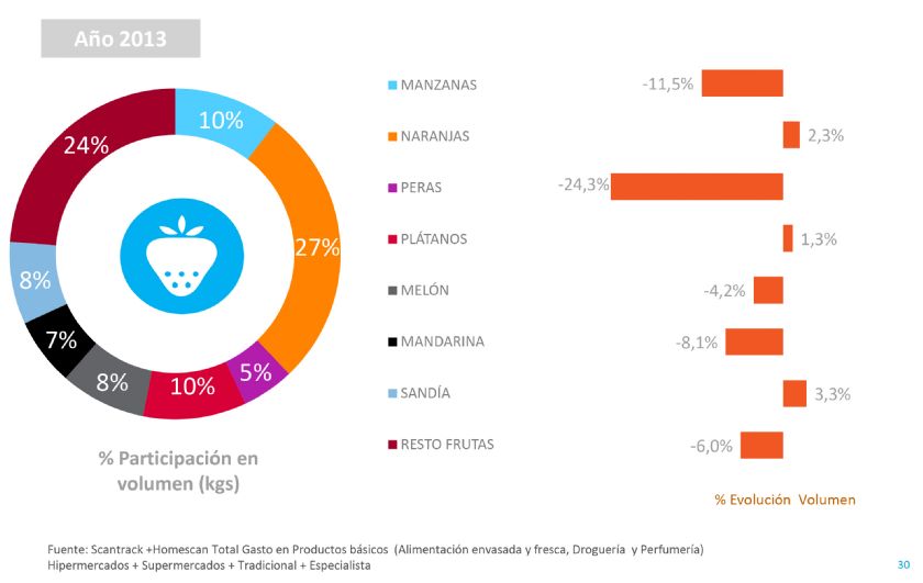 En general, podemos decir que las frutas y hortalizas son las únicas categorías de frescos que crecieron en ventas en el 2013, crecimiento marcado por la subida de precios con mayor caída de volumen que carnes o pescados. Frutas y hortalizas en conjunto suponen el 11,5% del gasto de los españoles en su cesta de la compra.